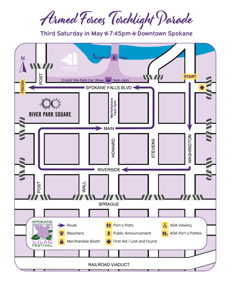 “If you have a family tradition of setting up chairs on First Avenue, you’ll need to find a new viewing location this year,” Hawkinson said. “While we are adjusting to the shortened route, our excitement for the Lilac Festival Armed Forces Torchlight Parade remains strong. This change will not stop us from delivering a vibrant, fun and memorable festival for the Lilac City.”